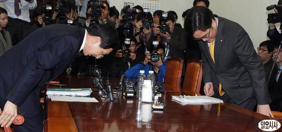 새누리당 김기현 원내수석부대표와 민주통합당 우원식 원내수석부대표가 8일 오후 서울 여의도 국회에서 정부조직 개편안 관련 여야 회담을 갖기 전 자리에 앉고 있다.