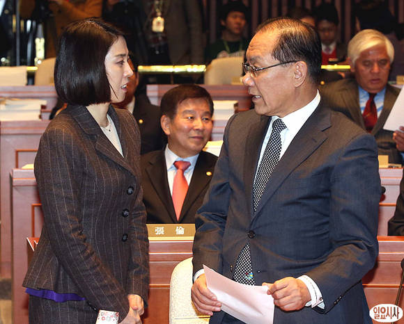 새누리당 황우여 대표(사진 우)와 신의진 원내대변인이 11일 오후, 서울 여의도 국회에서 열린 의원총회에서 대화를 나누고 있다.