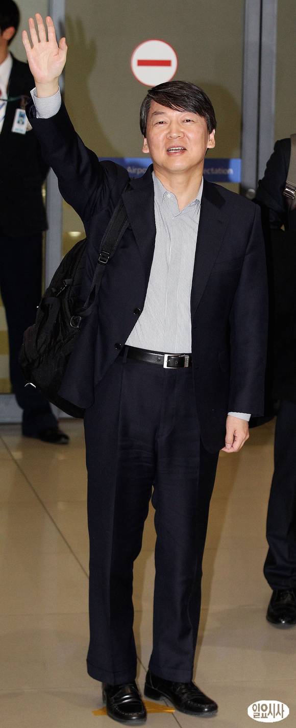 서울 노원병 지역의 4.24 재보궐선거 출마의사 밝힌 안철수 전 서울대 교수가 11일 오후 인천국제공항을 통해 입국한 뒤 지지자들을 향해 손을 흔들고 있다.