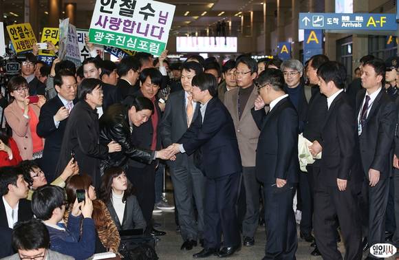 서울 노원병 지역의 4.24 재보궐선거 출마의사를 밝힌 안철수 전 서울대 교수가 11일 오후 인천국제공항을 통해 입국한 뒤 지지자들과 악수를 나누고 있다.