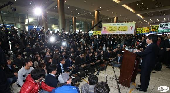 서울 노원병 지역의 4.24 재보궐선거 출마의사를 밝힌 안철수 전 서울대 교수가 11일 오후 인천국제공항을 통해 입국한 뒤 기자회견을 갖고 있다.