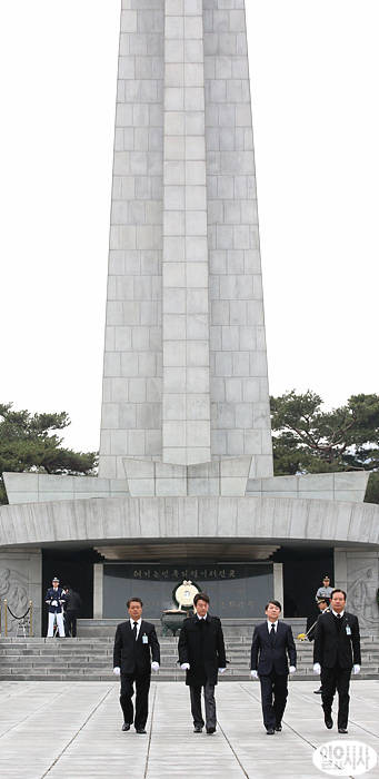 안철수 전 서울대 교수가 12일 오전 서울 동작구 국립현충원을 찾아 분향 후 기자회견을 갖기 위해 이동하고있다.