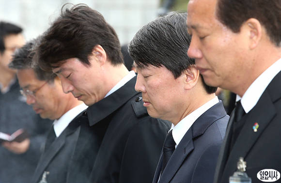 안철수 전 서울대 교수(사진 중앙)와 무소속 송호창 의원이 12일 오전 서울 동작구 국립현충원을 찾아 분향하면서 생각에 잠겨 있다.