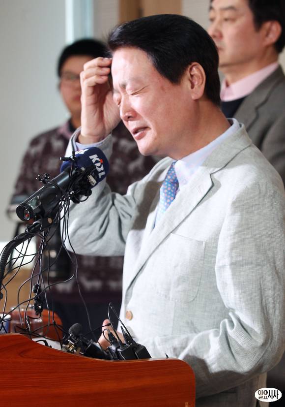 한선교 프로농구연맹(KBL) 총재가 12일 오전 서울 강남구 KBL센터에서 긴급 기자회견을 열고 최근 승부 조작 사태에 대한 사과 성명을 발표하고 있다.