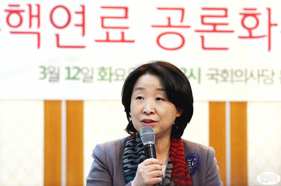 12일 오후 서울 국회의사당 귀빈식당에서 열린 사용 후 핵연료 공론화를 위한 공청회에서 진보정의당 심상정 의원이 인사말을 하고 있다.