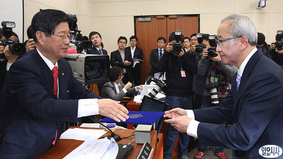 현오석 경제부총리 겸 기획재정부장관 내정자(사진 우)가 13일 오전 국회에서 열린 인사청문회에 출석한 자리에서 강길부 기재위원장에게 선언문을 건네고 있다.
