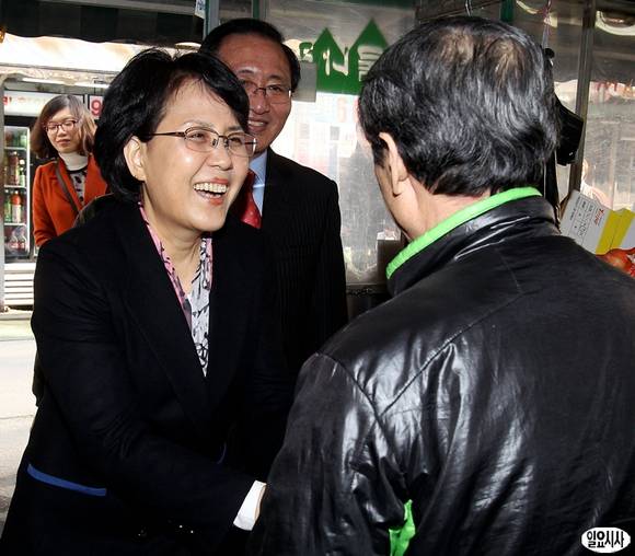 서울 노원병 보궐선거에 출마 선언한 진보정의당 김지선 후보와 남편인 노회찬 전 의원이 13일 오후 서울 노원구 당고개도깨비시장을 찾아 상인들과 인사를 나누고 있다.