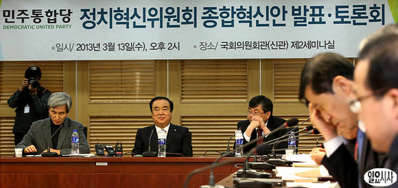 정해구 정치혁신위원장과 문희상 비대위원장(사진 좌)이 참석한 가운데 13일 오후, 서울 여의도 국회의원회관 제2세미나실에서 열린 민주통합당 '정치혁신위원회 종합혁신안 발표·토론회'가 열리고 있다.