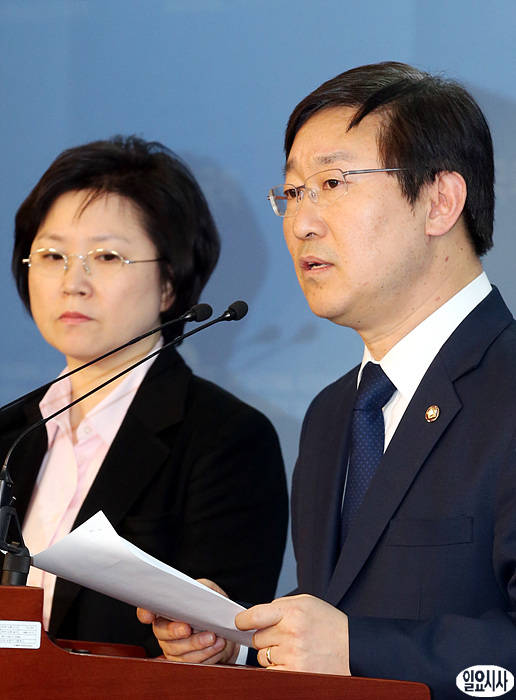 박범계 민주통합당 의원(사진 우)과 김현 대변인이 14일 오후, 서울 여의도 국회 정론관에서 NLL 항고 이유서 접수와 관련, 기자회견을 열고 있다.
