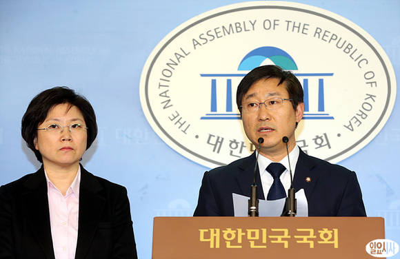 박범계 민주통합당 의원(사진 우)과 김현 대변인이 14일 오후, 서울 여의도 국회 정론관에서 NLL 항고 이유서 접수와 관련, 기자회견을 열고 있다.