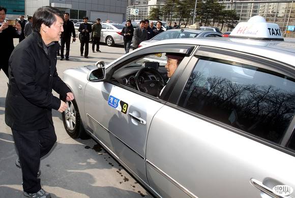 4ㆍ24 재보선 노원병 지역 출마를 선언한 안철수 전 서울대 교수가 15일 오전 서울 노원구 상계동 개인택시노조 노원지부를 방문해 간담회를 갖기에 앞서 택시기사들과 인사를 나누고 있다.