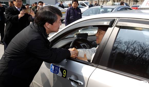 4ㆍ24 재보선 노원병 지역 출마를 선언한 안철수 전 서울대 교수가 15일 오전 서울 노원구 상계동 개인택시노조 노원지부를 방문해 간담회를 갖기에 앞서 택시기사들과 인사를 나누고 있다.