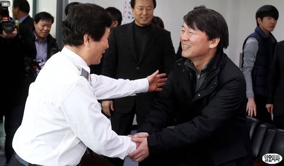 4ㆍ24 재보선 노원병 지역 출마를 선언한 안철수 전 서울대 교수가 15일 오전 서울 노원구 상계동 개인택시노조 노원지부를 방문해 간담회를 갖기에 앞서 택시기사들과 인사를 나누고 있다.