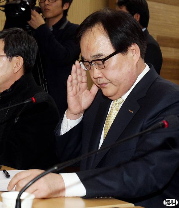 정창영 코레일 사장이 15일 오후 서울 중구 코레일 서울사옥에서 열린 '용산역세권 사업 정상화를 위한 제안 설명회'에서 안경을 고쳐 쓰고 있다.