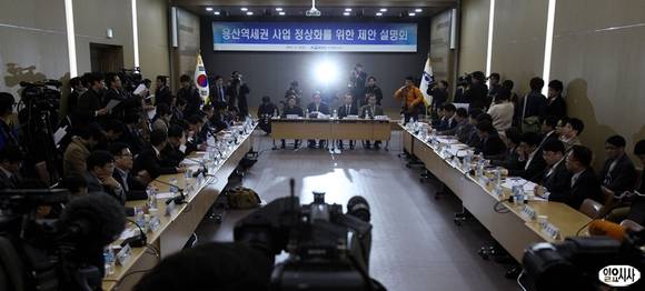 15일 오후 서울 중구 코레일 서울사옥에서 '용산역세권 사업 정상화를 위한 제안 설명회'가 열리고 있는 가운데 정창영 코레일 사장이 모두발언을 하고 있다.