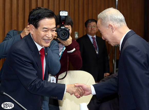 남재준 국정원장 후보자(사진 우)가 18일 오전, 서울 여의도 국회에서 열린 인사청문회에 출석해 서상기 정보위원장과 악수를 나누고 있다.