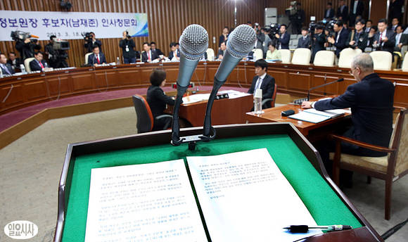 남재준 국정원장 후보자(사진 우), 서상기 정보위원장 등이 참석한 가운데, 18일 오전 서울 여의도 국회에서 남 내정자에 대한 인사청문회가 열리고 있다.