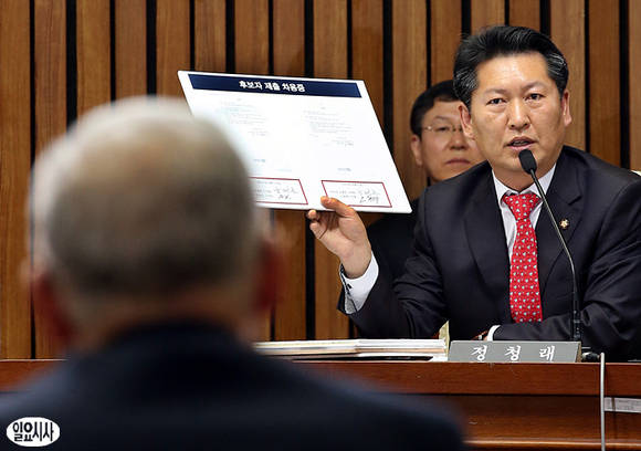남재준 국정원장 후보자가 18일 오전, 서울 여의도 국회에서 열린 인사청문회에 출석해 민주통합당 정청래 의원의 질의를 받고 있다.