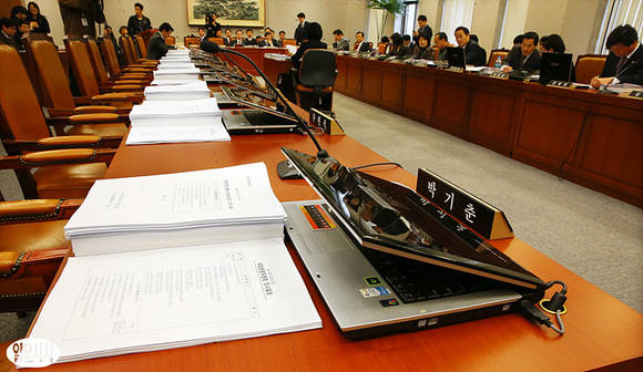 새누리당 운영위원들이 착석해 있는 가운데, 19일 오전 서울 여의도 국회에서 열린 운영위원회 전체회의가 민주통합당 운영위원들의 불참으로 파행위기를 맞고 있다.