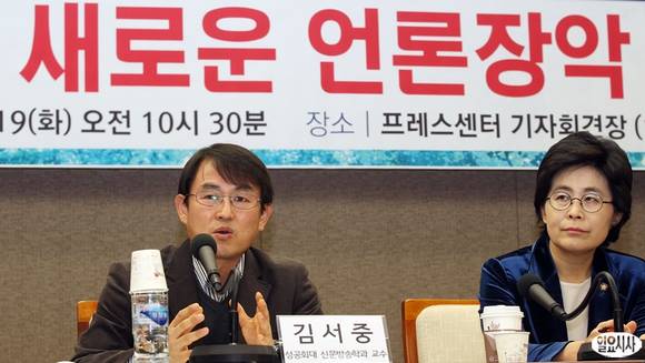 19일 오전 서울 중구 프레스센터에서 '박근혜 정부, 새로운 언론장악 시작하나'를 주제로 정부조직법 문제점 긴급 점검 토론회 및 언론노조 기자회견이 열리고 있다. (왼쪽부터 김서중 성공회대 신문방송학과 교수, 유승희 민주통합당 의원)