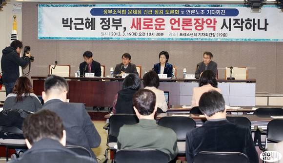19일 오전 서울 중구 프레스센터에서 '박근혜 정부, 새로운 언론장악 시작하나'를 주제로 정부조직법 문제점 긴급 점검 토론회 및 언론노조 기자회견이 열리고 있다. (왼쪽부터 김경환 상지대 언론광고학부 교수, 김서중 성공회대 신문방송학과 교수, 유승희 민주통합당 의원, 채수현 언론노조 정책위원)