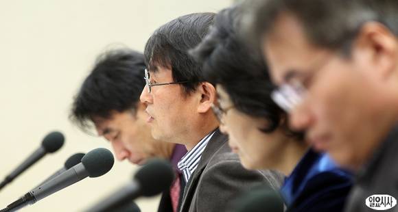 19일 오전 서울 중구 프레스센터에서 '박근혜 정부, 새로운 언론장악 시작하나'를 주제로 정부조직법 문제점 긴급 점검 토론회 및 언론노조 기자회견이 열리고 있다. (왼쪽부터 김경환 상지대 언론광고학부 교수, 김서중 성공회대 신문방송학과 교수, 유승희 민주통합당 의원, 채수현 언론노조 정책위원)