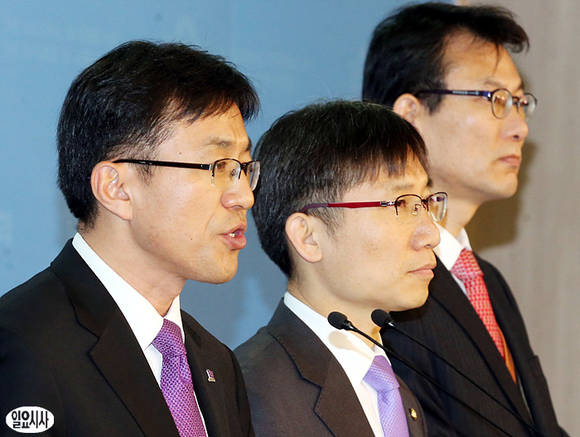 19일 오전, 통합진보당 정태흥 서울시당위원장(사진 좌)이 서울 여의도 국회 정론관에서 노원병 재보궐선거 출마를 선언하고 있다.