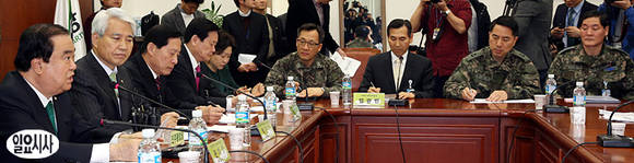 민주통합당 문희상 비상대책위원장(사진 좌)이 19일 국회 당 대표실에서 열린 한반도평화안보특위 1차회의 및 안보점검 간담회에 참석해 모두 발언을 하고 있다.