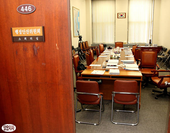 19일 오전 9시30분에 예정돼 있던 여야의 정부조직법 처리를 위한 행안위 법안심사 소위가 잠정연기된 채 행안위 소위원회실이 텅텅 비어 있다.