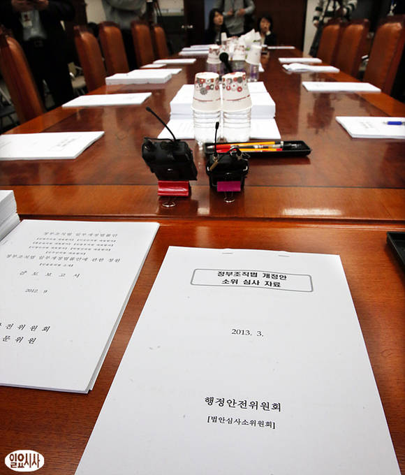 19일 오전 9시30분에 예정돼 있던 여야의 정부조직법 처리를 위한 행안위 법안심사 소위가 잠정연기된 채 행안위 소위원회실 테이블 위에 소위 심사 자료가 놓여져 있다.