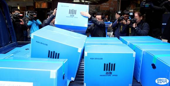 서울중앙지검 금융조세조사1부가 19일 오전 기업 대출금리를 전산 조작해 거액의 부당이득을 챙긴 혐의로 외환은행 본점에 대한 압수수색에 들어간 가운데 이날 오후 서울 중구 외환은행 본점에서 검찰수사 관계자들이 압수물품을 트럭에 싣고 있다.