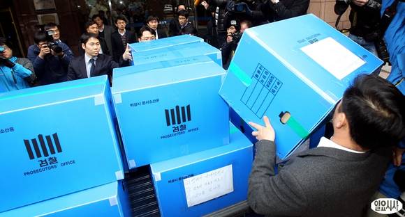 서울중앙지검 금융조세조사1부가 19일 오전 기업 대출금리를 전산 조작해 거액의 부당이득을 챙긴 혐의로 외환은행 본점에 대한 압수수색에 들어간 가운데 이날 오후 서울 중구 외환은행 본점에서 검찰수사 관계자들이 압수물품을 트럭에 싣고 있다.