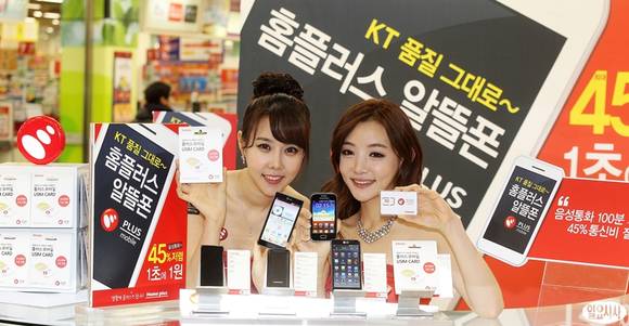 20일 오전 서울 홈플러스 영등포점에서 열린 '플러스모바일' 출시행사에서 모델들이 알뜰폰을 선보이고 있다. 이번에 출시된 홈플러스 이동통신 전문 브랜드 '플러스모바일'은 총 5가지 요금제로 구성되어 있으며, 기본료는 6000원부터 선택할 수 있다.