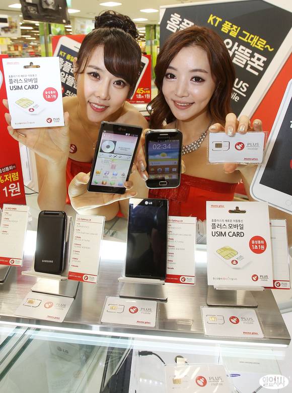 20일 오전 서울 홈플러스 영등포점에서 열린 '플러스모바일' 출시행사에서 모델들이 알뜰폰을 선보이고 있다. 이번에 출시된 홈플러스 이동통신 전문 브랜드 '플러스모바일'은 총 5가지 요금제로 구성되어 있으며, 기본료는 6000원부터 선택할 수 있다.