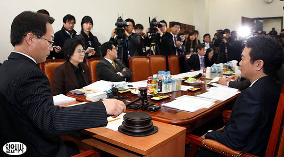 20일 오전 서울 여의도 국회 문화체육관광방송통신위원회 소회의실에서 열린 법안심사소위에서 조해진 새누리당 문방위 법안심사소위원장이 의사봉을 두드리고 있다.