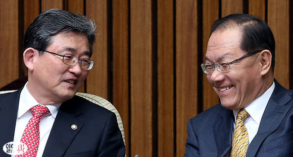 황우여 새누리당 대표(사진 우)와 이한구 원내대표가 20일 오전 서울 여의도 국회에서 열린 최고중진연석회의에 참석해 활짝 웃고 있다.