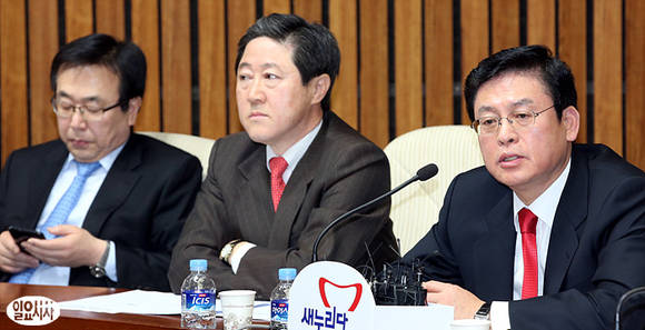 20일 오전 서울 여의도 국회에서 열린 최고중진연석회의가 열린 가운데 정우택 최고위원(사진 우)이 발언하는 도중, 서병수 사무총장(사진 좌)은 스마트폰 검색을, 유기준 최고위원은 다른 생각을 하고 있다.