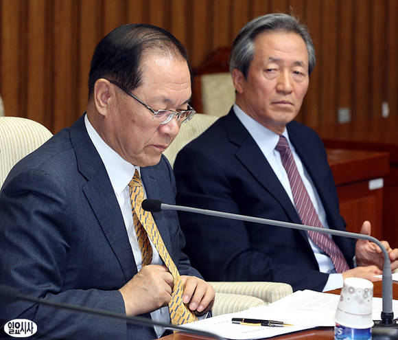 황우여 새누리당 대표(사진 좌)가 20일 오전 서울 여의도 국회에서 열린 최고중진연석회의에 참석해 자료를 확인하고 있다.