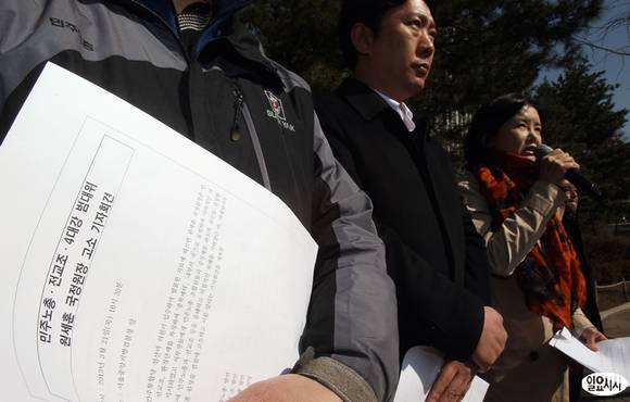 민주노총과 전교조, 4대강 범대위 관계자들이 21일 오전 서울 서초동 서울 중앙지검에 원세훈 국가정보원 원장을 고발하기에 앞서 기자회견을 갖고 있다. 이들은 민주통합당 진선미 의원이 입수하여 발표한 자료에서 원세훈 원장이 민주노총과 전교조, 환경단체를 특정하여 '종북세력', '내부의 적'으로 표현하며 악의적인 여론조작을 지시하였다며 고발취지를 밝혔다.