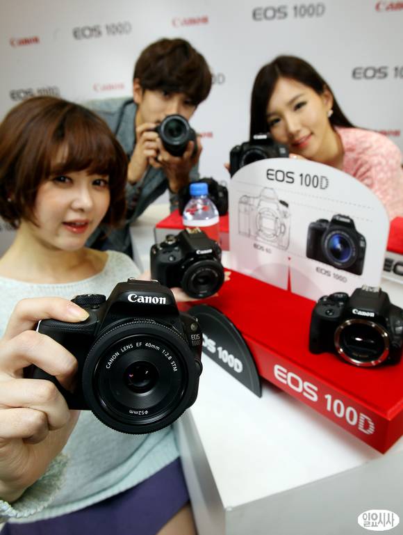 캐논코리아컨슈머이미징(대표이사 강동환)이 21일 오후 서울 태평로 코리아나호텔에서 DSLR 카메라 'EOS 100D'를 선보이고 있다. 'EOS 100D'는 APS-C 타입 이미지 센서 기반의 세계 최소, 최경량 DSLR카메라로 초보자들과 여성들을 위한 맞춤형 카메라이다. 한편 캐논은 한 층 업그레이드된 동영상 촬영 성능과 다양한 편의 기능을 탑재한 'EOS 700D'도 함께 출시했다.