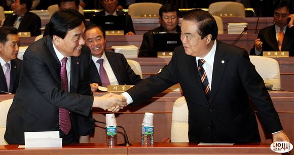 22일 오전 서울 여의도 국회에서 열린 의원총회에서 문희상 비대위원장과 박기춘 원내대표가 인사를 나누고 있다.