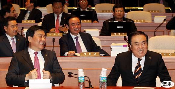 22일 오전 서울 여의도 국회에서 열린 의원총회에서 문희상 비대위원장과 박기춘 원내대표가 미소를 짓고 있다.