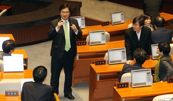 22일 오후 서울 여의도 국회에서 열린 본회의에서 우원식 민주통합당 원내수석부대표가 동료의원들에게 공지사항을 전달하고 있다.