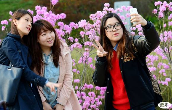 19일 서울 이화여대 교정에 활짝 핀 진달래꽃을 배경으로 학생들이 사진촬영을 하고 있다.