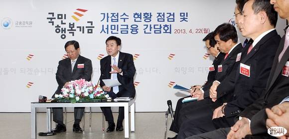 신제윤 금융위원장(왼쪽에서 두번째)이 22일 오전 서울 강남구 한국자산관리공사에서 열린 '국민행복기금 가접수 현황점검 서민금융 간담회'에서 모두발언을 하고 있다.