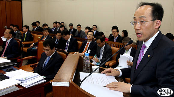 국회가 17조3000억원 규모의 추가경정예산안에 대한 심사에 착수한 22일 오전, 서울 여의도 국회에서 열린 기획재정위원회 전체회의에서 기획재정부 추경호 1차관(사진 오른쪽)이 의원들의 질의에 답하고 있다.