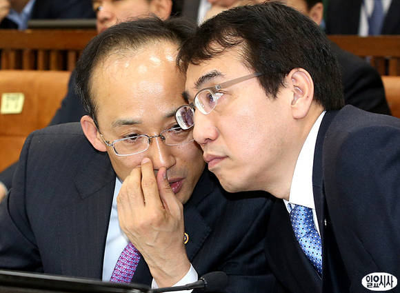국회가 17조3000억원 규모의 추가경정예산안에 대한 심사에 착수한 22일 오전, 서울 여의도 국회에서 열린 기획재정위원회 전체회의에서 기획재정부 추경호 1차관이 관계자와 귀엣말을 나누고 있다.
