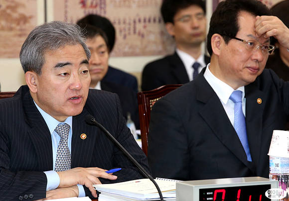 유진룡 문화체육관광부 장관(사진 왼쪽)이 23일 오전 서울 여의도 국회 교육문화체육관광위원회 회의실에서 열린 추가경정예산안 관련 전체회의에서 의원들의 질의에 답하고 있다. 오른쪽은 서남수 교육부 장관