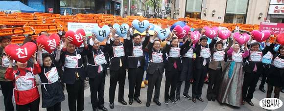 한국관광협회중앙회(회장 남상만)와 한국방문의해위원회(위원장 신동빈)가 일본 최대 연휴인 골든위크와 중국 노동절을 앞두고 23일 오전 서울 중구 명동 일대에서 '친절한 대한민국 만들기 캠페인'을 벌이고 있다.