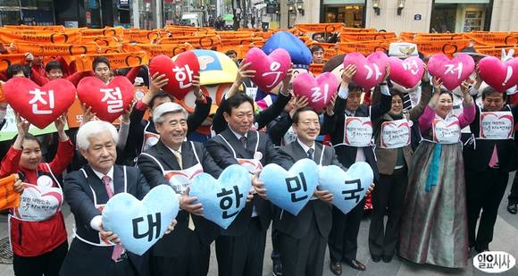 한국관광협회중앙회(회장 남상만)와 한국방문의해위원회(위원장 신동빈)가 일본 최대 연휴인 골든위크와 중국 노동절을 앞두고 23일 오전 서울 중구 명동 일대에서 '친절한 대한민국 만들기 캠페인'을 벌이고 있다.